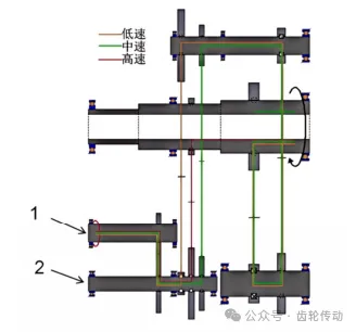 通過機床的實際運行工況,用Romax Designer軟件進行描述機床傳動系統運動平面簡圖,并標注低速、 中速、高速3種運動工況的運行狀態,3種運動工況的運行狀態如圖2所示。材料為中碳鋼,楊氏模量為2.07×105MPa,密度為7800 kg/m3,泊松比為0.29,屈服強度為380MPa,抗拉強度為 660MPa。