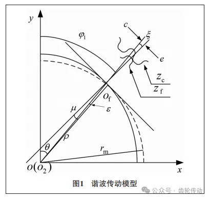 柔輪與剛輪間轉(zhuǎn)角關(guān)系:固定波發(fā)生器坐標(biāo)系,并以波發(fā)生器的回轉(zhuǎn)中心o為原點,長軸為y軸,建立坐標(biāo)系,則波發(fā)生器、柔輪、剛輪之間的運(yùn)動關(guān)系如圖1所示。