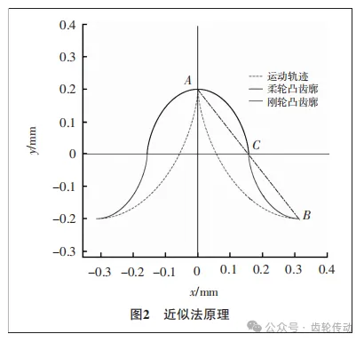 傳動齒廓設(shè)計:根據(jù)齒條近似法原理,當(dāng)剛輪的齒數(shù)無窮大時,此時柔輪將相對于剛輪沿著運(yùn)動軌跡平移。圖2為齒條近似原理圖,其中AB曲線為柔輪相對于剛輪的運(yùn)動軌跡,將A點作為映射的起始點,將B點作為映射的結(jié)束點,按照0.5倍的比例進(jìn)行曲線映射,得到了剛輪凸齒廓BC與柔輪凸齒廓AC,由于曲線映射的關(guān)系,柔輪與剛輪齒廓均保留了運(yùn)動軌跡的特征,即柔輪凸齒廓與剛輪凸齒廓間將實現(xiàn)連續(xù)嚙合。其中柔輪中性層在剛輪坐標(biāo)下的運(yùn)動軌跡AB 的軌跡方程表示為:
