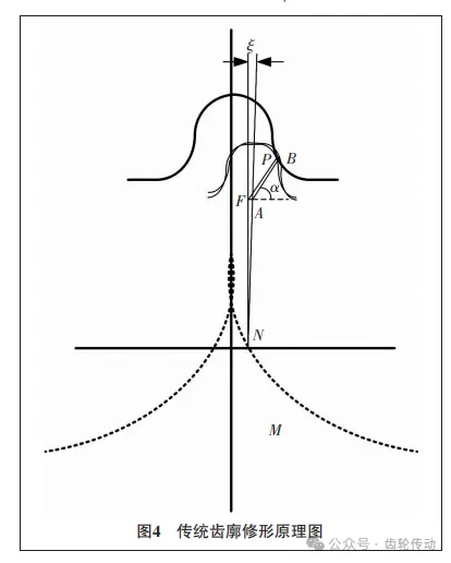 傳統(tǒng)的修形方法是假設(shè)理想嚙合條件下柔輪齒廓與剛輪齒廓的嚙合點為P,但由于轉(zhuǎn)角影響的存在,柔輪在嚙合點P處沿著N旋轉(zhuǎn)了ζ,從而柔輪與剛輪齒廓將產(chǎn)生干涉,干涉量可以通過嚙合點P的位移PB來表示。如圖4所示,F(xiàn)點為柔輪原始齒廓法線與中心線的交點,由于旋轉(zhuǎn)角度ξ較小,因此點P在轉(zhuǎn)角ξ的影響下產(chǎn)生的位移PB可以用弧長FA代替,其表達(dá)式為