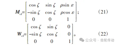 改進(jìn)法齒廓修形:根據(jù)齒輪嚙合原理中的坐標(biāo)系變換原理,柔輪固定坐標(biāo)系可通過坐標(biāo)系變化矩陣Mcf和底矢變化矩陣Wcf變化到剛輪坐標(biāo)系,其中矩陣Mcf和矩陣Wcf表示為: