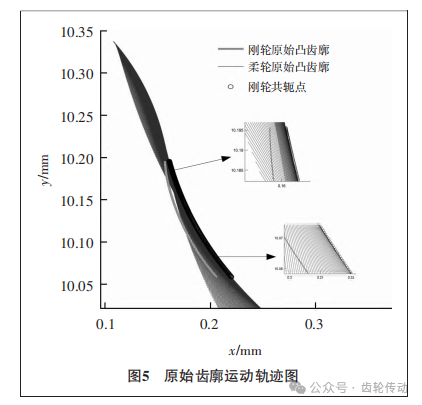 為了分析原始柔輪凸齒廓相對于剛輪的運(yùn)動狀態(tài),直觀地反映裝配后諧波傳動齒廓的嚙合情況,在將柔輪凸齒廓與剛輪凸齒廓分別轉(zhuǎn)換到各自坐標(biāo)系后使用嚙合矩陣Mcf,得到了圖5所示的(0,π)區(qū)間內(nèi)柔輪的運(yùn)動軌跡圖。