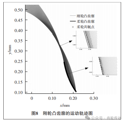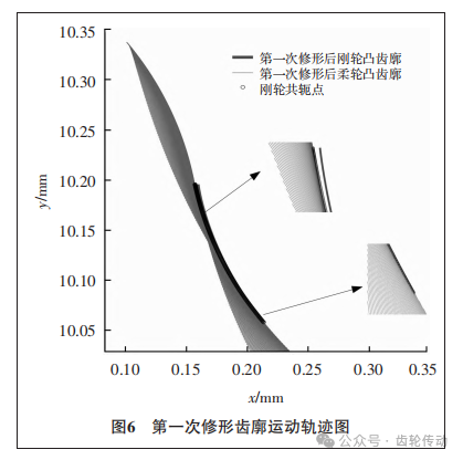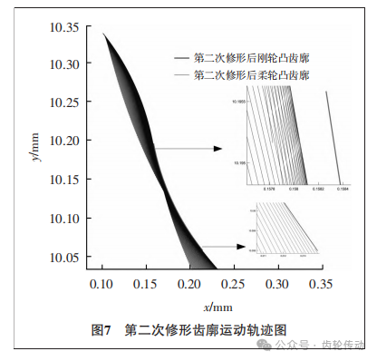 通過圖7可以看到剛輪初始端依然存在過度修形的情況,但此時上端的側(cè)隙分布已經(jīng)處于0.5μm以下,屬于合理范圍之內(nèi),故不再對凸齒廓進(jìn)行第三次修形。至此,柔輪與剛輪的凸齒廓修形完畢。根據(jù)修形后的剛輪凸齒廓,通過使用嚙合矩陣 Mfc,采用剛輪包絡(luò)柔輪的方法,計算出剛輪的運(yùn)動軌跡。同樣采用boundary函數(shù)提取柔輪的共軛點,通過這種方式,可以得到與剛輪凸齒廓共軛的柔輪凹齒廓。