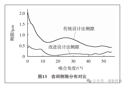 從圖13可以看出,與傳統(tǒng)法相比,改進(jìn)法設(shè)計下的齒廓側(cè)隙整體更小,且更加平穩(wěn)。傳統(tǒng)S型齒廓設(shè)計方法由于凹齒廓是直接由凸齒廓映射所得,因此在嚙合區(qū)整體側(cè)隙偏大,而在嚙入?yún)^(qū)的側(cè)隙則有所下降。由于改進(jìn)法設(shè)計下的S型齒廓在凸齒廓初始端存在一定的過度修形,因此在嚙合區(qū)的側(cè)隙相對于嚙入?yún)^(qū)有所上升,但上升的幅度較小,整體側(cè)隙分布情況趨于穩(wěn)定,在一定程度上提高了回轉(zhuǎn)精度。