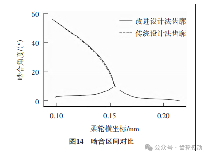 嚙合區(qū)域分析:柔輪齒廓與剛輪齒廓的嚙合大致可以分為2個區(qū)域:1)嚙合區(qū)。此時柔輪凸齒廓與剛輪凹齒廓間會產(chǎn)生嚙合,與此同時柔輪凹齒廓與剛輪凸齒廓同樣將發(fā)生接觸。2)嚙入?yún)^(qū)。柔輪凸齒廓與剛輪凸齒廓間在這個區(qū)間內(nèi)將產(chǎn)生嚙合,此區(qū)域也是諧波傳動的主要嚙合區(qū)。因此計算嚙合區(qū)間時需要進(jìn)行分段求解。 兩種修形方法計算出的嚙合區(qū)間如圖14所示。 由于傳統(tǒng)修形法的凹齒廓采用直接映射的方式,因此凸齒廓與凹齒廓在嚙合的過程中不發(fā)生接觸,因此在整個運(yùn)動過程中只有兩段凸齒廓發(fā)生共軛,因此該設(shè)計方法下只有一段嚙合區(qū)間。而改進(jìn)法下的凹齒廓是根據(jù)運(yùn)動軌跡包絡(luò)求得的,因此即使是在嚙合區(qū)內(nèi)也有較好的接觸情況。兩種修形方法均在[9.334°,55.645°]的區(qū)間內(nèi)發(fā)生共軛,而通過改進(jìn)法設(shè)計的柔輪齒廓,在[2.154°,7.18°]區(qū)間實現(xiàn)了兩點共軛,與此同時柔輪的凸齒廓在[2.154°,8.975°]和 [9.334°,55.645°]區(qū)間上分別實現(xiàn)了與剛輪凹齒廓與凸齒廓間的嚙合,實現(xiàn)了二次共軛,證明了改進(jìn)法設(shè)計的齒廓增大了共軛區(qū)域,降低了柔輪嚙合過程中的軸向應(yīng)力,提高了傳動效率,使得傳動更加可靠,在一定程度上延長了減速器的使用壽命。