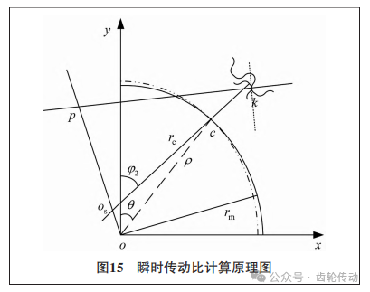 瞬時傳動比:通過平均積分角速度求得的傳動比只能從宏觀角度上描述諧波減速器的運(yùn)動狀況,但實際上諧波減速器的瞬時傳動比是變化的。瞬時傳動比的波動會直接影響減速器運(yùn)行的穩(wěn)定性,而傳動比誤差既來源于中性層曲線的形狀也取決于齒廓曲線。如圖15所示,當(dāng)波發(fā)生器固定時,若柔輪非變形端以恒定角速度ω1回轉(zhuǎn),則在變形端上的點c將以瞬時角速度ω1c圍繞中性層曲線在c點處的曲率中心os 回轉(zhuǎn),由于線速度相等,故有