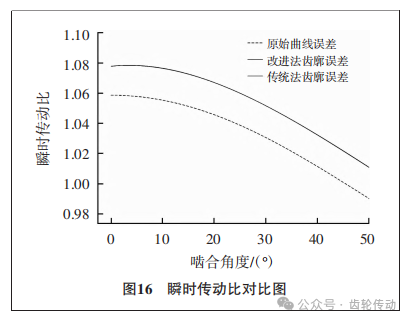 因為兩種修形方法均采用相同的中性層曲線,故原始曲線誤差相同。通過式(34)和式(36)可以發(fā)現(xiàn)瞬時傳動比的波動幅度在一定程度上與瞬時曲率中心直接關(guān)聯(lián),通過計算發(fā)現(xiàn)中性層半徑越大,徑向變形量越小,瞬時傳動比就越趨于穩(wěn)定。
