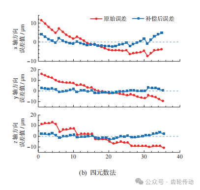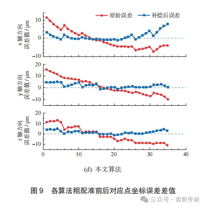 本實驗點云規模小,在該模型中采用定向對應點, 引入權重系數k,可以有效避免錯誤對應點的產生。利用本文提出的基于對偶四元數優化的ICP迭代算法誤差補償模型對上述齒面實測數據與理論數據之間的偏差進行補償,將得到的結果分別與基于SVD分解法、四元數法和L-M法的粗配準結果進行對比,并以對應點間歐氏距離作為評定標準。由實測數據計算出初始平均誤差為10.34μm,初始平均誤差最大誤差為22.11μm,然后對各算法誤差補償效果進行評估。 各算法的粗配準結果如圖9所示,由圖可知,4種算法經過粗配準后都更靠近零刻線,且SVD法和四元數法進行粗配準的誤差補償效果相差不大,L-M法的x軸方向補償后誤差值與理想坐標偏離較大,本文算法補償后坐標值與理想坐標值之差與其他3種算法相比更靠近零刻線。證明在粗配準階段本文算法補償效果為4種算法中最佳。