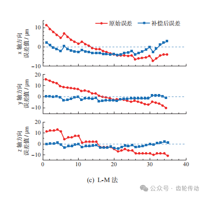 在粗配準之后,將各算法獲取的配準參數值作為精配準的初始參數值。利用點到點 (point-to-point) ICP迭代算法進行精配準,各算法模型中權重k分別等于40%、70%和90%時的補償效果如圖10所示。由圖可知,在實驗的3組不同權重中,各類算法權重系數k=70%時誤差補償效果最佳,k=90%時次之,k=40%時較差。雖然SVD法、四元數法和L-M法對齒面誤差均有補償作用,但本文算法最終的補償效果更好,且最終誤差更小。