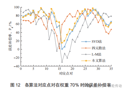 為比較最優權重下各算法對應點的誤差補償效果, 將各算法的全部齒面測量點的誤差補償率繪出,如圖12所示。由圖可得,4種算法整體趨勢大致相同, 且第15—第18點的誤差補償率都偏低,這是由于第15—第18點的原始誤差(圖9)本身比較小,隨著齒面整體旋轉配準,此處誤差呈現出放大現象。本文算法與其他3種算法相比起伏較小,且整體誤差補償率較高,證明了本文算法相比于其他3種算法有更高的求解精度。