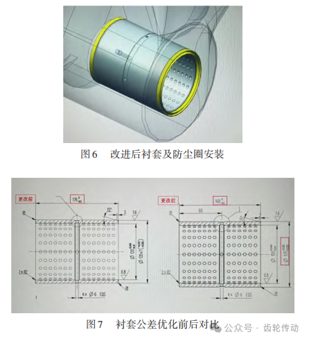軸套外圈過盈量,使用液氮進行冷裝,進一步提升安裝效果,避免在長時間惡劣工況下出現(xiàn)脫套的問題,進而封死軸去發(fā)生松動而產(chǎn)生潤滑脂內(nèi)泄的通道。軸套增大的過盈量有利于市場機型的更換,因市場挖掘機工況惡劣工作時間長或多或少已經(jīng)出現(xiàn)動臂后支座軸套安裝孔孔徑微量增大的情況,原有配合公差已無法滿足現(xiàn)安裝要求(見圖7)。