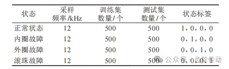 實驗數據集采用美國凱斯西儲大學(CWRU)公開數據。CWRU數據集是世界公認的故障診斷標準數據集,截至2015年,僅僅機械故障診斷領域頂級期刊就發表過41篇CWRU數據診斷的文章。因此本文的實驗數據也采用該公開數據集。文章選取電機轉速在1797r/min下的4種狀態數據,包括正常數據、內圈故障、外圈故障、滾動體損傷。為了保證數據的充分性,針對每一種狀態,共選取了1000個樣本,其中訓練樣本和測試樣本的比例為1∶1,對應的數據集描述如表1所示。 表1 實驗數據集描述