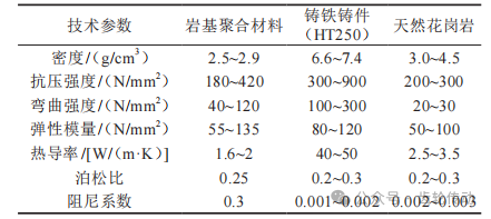 巖基聚合材料是一種新型復合材料,是以玄武巖顆粒為集料,以環氧樹脂和固化劑為膠結料,且加入一定的增強材料和促進劑, 通過特殊工藝復合而成的。相比鑄鐵、鋼、花崗巖等材料,其振動阻尼、耐 腐蝕性、加工制造精度等特性都更具優勢。