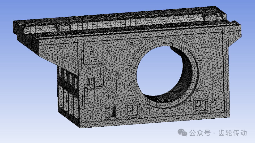 模型的網格劃分是仿真過程中非常重要的步驟。一方面,網格劃分應形成足夠小的單元,以達到適當的精度,以便于更接近模型實際狀態。另一方面,在ANSYS Workbench分析軟件中,由于網格劃分的方法有許多種,會形成不同的有限元方程,因此花費的計算時間也不盡相同,有時方程甚至無法求解。由于仿真中對這兩個方面都有要求,因此要綜合考慮。根據數控螺旋錐齒輪加工機床的立柱實體模型特征和立柱結構特征,在前期網格劃分時采用三維六面體八節點實體單元來生成網格單元,但是立柱中有許多線和面,控制網格質量時較為復雜且效果不佳,所以改為采用自動網格劃分的方法,取smartsize=20mm。在立柱模型網格單元劃分完成后,檢查其網格質量是否符合計算要求(平均單元質量為0.74,平均傾斜度為0.35),立柱模型共有512 411個網格,309 427個節點,網格劃分如圖3所示。
