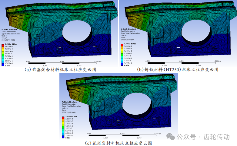 圖5 不同材料的數控螺旋錐齒輪加工機床立柱的應變云圖