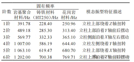 2)模態分析結果表明,巖基聚合材料機床立柱的各階固有頻率(均大于300Hz)明顯高于鑄鐵材料(HT250)和花崗巖材料機床立柱的各階固有頻率,且巖基聚合材料機床立柱的各階固有頻率均至少比本機床的主軸頻率高15%。因此,巖基聚合材料機床立柱的結構設計可更大范圍避免機床共振。