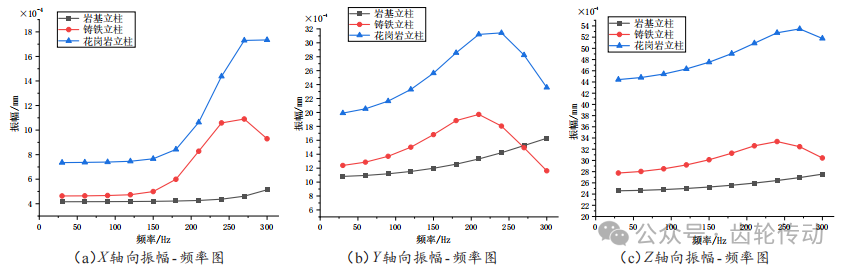 在相同加載及頻率范圍內,通過比較3種材料機床立柱的振幅 - 頻率圖,可以得出以下結論:巖基材料機床立柱的振幅變化相對較小,顯示出優越的抗振性能。具體而言,巖基材料機床立柱的最大響應振幅均小于鑄鐵材料(HT250)和花崗巖材料機床立柱的最大響應振幅。在X軸、Y軸和Z軸方向上,巖基材料機床立柱的最大振幅相比于鑄鐵材料(HT250)機床立柱的最大振幅分別降低了51.89%、17.26%、17.42%;而相比于花崗巖材料機床立柱,則分別降低了 70.52%、48.09%、48.60%。這些數據充分證明了巖基材料機床立柱在抗振性能方面的優勢,表明其在實際應用中能夠有效減少振動對機床穩定性和加工精度的影響。