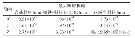3)通過諧響應分析,巖基聚合材料機床立柱在X軸、Y軸和Z軸方向上的最大響應振幅,相比于鑄鐵材料(HT250)機床立柱分別降低了51.89%、17.26%、17.42% ;相比于花崗巖材料機床立柱分別降低了70.52%、48.09%、48.60%。這進一步證明了巖基聚合材料在機床靜態和動態性能方面具有一定的優越性。