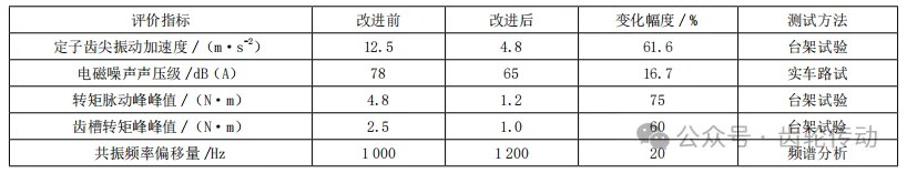 測(cè)試結(jié)果:利用上述評(píng)價(jià)方式,對(duì)相關(guān)指標(biāo)數(shù)據(jù)進(jìn)行分析,本文的驅(qū)動(dòng)電機(jī)NVH性能參數(shù)改進(jìn)效果如表2所示?;趨?shù)對(duì)比結(jié)果可以看出,斜槽設(shè)計(jì)能夠顯著分散電磁力諧波,降低定子振動(dòng)幅值,同時(shí)有效提升轉(zhuǎn)子動(dòng)平衡等級(jí)。應(yīng)用納米晶和約束阻尼材料,能夠有效降低鐵芯鐵損,減弱振動(dòng)傳遞。優(yōu)化主動(dòng)控制系統(tǒng)響應(yīng)時(shí)間,也能有效降低車內(nèi)噪聲水平。由此可見(jiàn),系統(tǒng)性改進(jìn)可有效提升新能源汽車驅(qū)動(dòng)電機(jī)NVH整體性能。