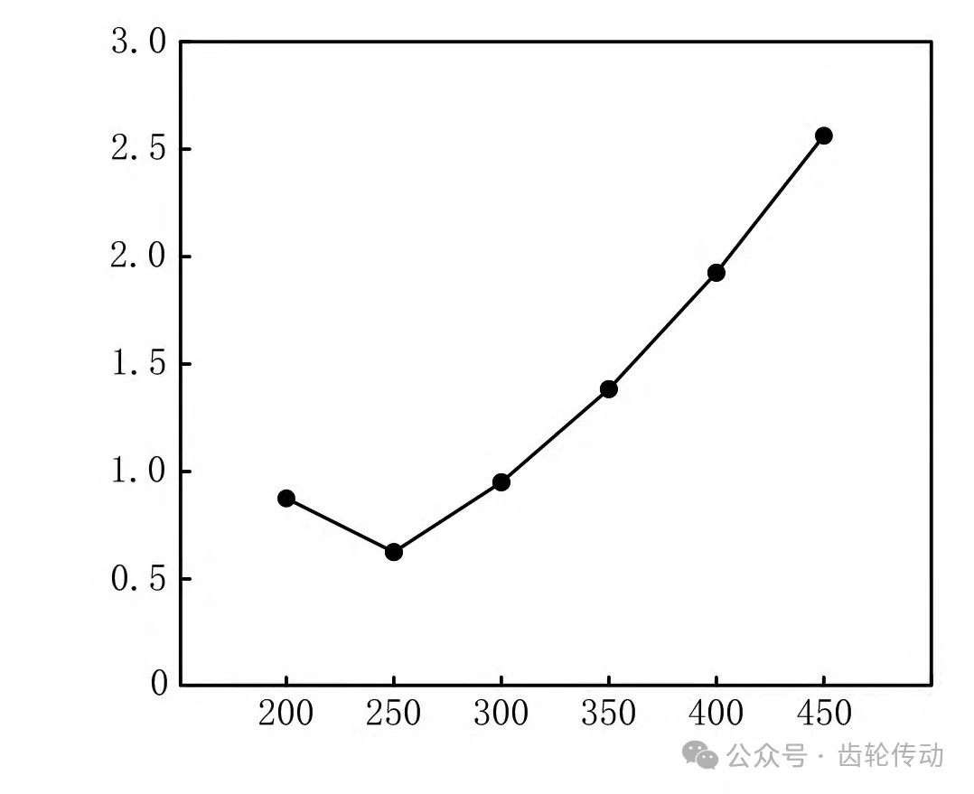 從圖2可以看出,隨著切削力的不斷增加,弧齒錐齒輪硬齒面表面粗糙度呈先降低后升高的趨勢,且當切削力為250N時,硬齒面表面粗糙度Ra最小,為0.63μm。這主要是因為弧齒錐齒輪在進行高速切削時,刀具需要克服一定的阻力,如果切削力過小,就無法滿足齒輪材料表面的切削需求,導致切削后的硬齒面質量較差;但如果切削力過大,會增加刀具與齒輪材料表面之間的接觸壓力,導致硬齒面在高速切削過程中出現表面變形的情況,從而增加表面粗糙度。因此,在實際的弧齒錐齒輪硬齒面高速切削加工中,為得到更好的硬齒面表面質量,需要選擇合適的切削力。