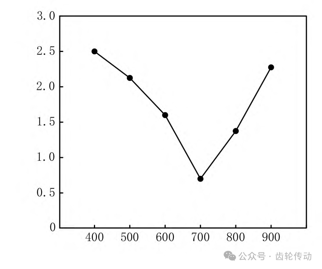 從圖3可以看出,在弧齒錐齒輪硬齒面高速切削加工過程中,切削速度對硬齒面的表面質量有著顯著影響。隨著切削速度的加快,弧齒錐齒輪硬齒面的表面粗糙度呈先下降后升高的趨勢,當切削速度為700m/min時,硬齒面的表面粗糙度Ra最小,為0.71μm。這主要是因為如果切削速度過低,刀具和弧齒錐齒輪之間的摩擦時間就會增加,促使二者之間的摩擦力增大,從而導致硬齒面的表面質量較差。如果切削速度過快,雖然可以減少刀具與弧齒錐齒輪之間的摩擦時間,但可能會引發刀具振動與弧齒錐齒輪變形等問題,進而促使硬齒面的表面粗糙度值增大。因此,在弧齒錐齒輪硬齒面高速切削加工過程中,切削速度與硬齒面表面質量之間的關系較為復雜,需要通過調整切削速度來獲得更好的硬齒面表面質量。