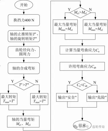 換擋軸及軸承:建立換擋軸力學模型,并根據換擋軸校核流程對換擋軸及軸承進行校核。經程序計算后證實,各個軸的強度滿足要求,換擋步進電機輸出軸上的深溝球軸承壽命及換擋軸兩端滑動軸承壽命均滿足設計要求。換擋軸校核流程如圖3所示。