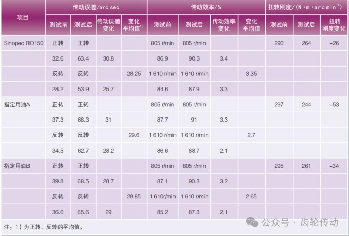 ◇ 扭轉剛度的下降:Sinopec RO150<指定用油B<指定用油A。在固定設備、操作條件的前提下,潤滑油的不同可以認為是引起傳動誤差、傳動效率和扭轉剛度變化的唯一因素。RV減速器傳動誤差、扭轉剛度的變化與軸承剛度、齒輪嚙合剛度、構件彈性、材料疲勞、潤滑條件等多種因素有關,傳動誤差的增加和扭轉剛度的下降表明,減速器在經歷過相當于全壽命周期的運行后,軸承、齒面結構件、材料等都發生了一定程度的磨損和破壞,裝填Sinopec RO150的設備傳動誤差增大最小、扭轉剛度下降最少,表明該設備的磨損最輕微,相應所裝填的潤滑油對設備的保護性最好,性能優于另外兩種潤滑油。理論上,傳動效率應與扭轉剛度的變化趨勢相同,且隨著設備運行時間的增加,兩者都應該呈現下降的趨勢。但臺架試驗數據表明,裝填了3種潤滑油的減速器的傳動效率都不降反升,這是由于試驗中采用了全新減速器,在臺架試驗前測量傳動效率,設備還處在磨合階段,而試驗后再次測量傳動效率,設備已經完成了磨合,故此傳動效率上升。