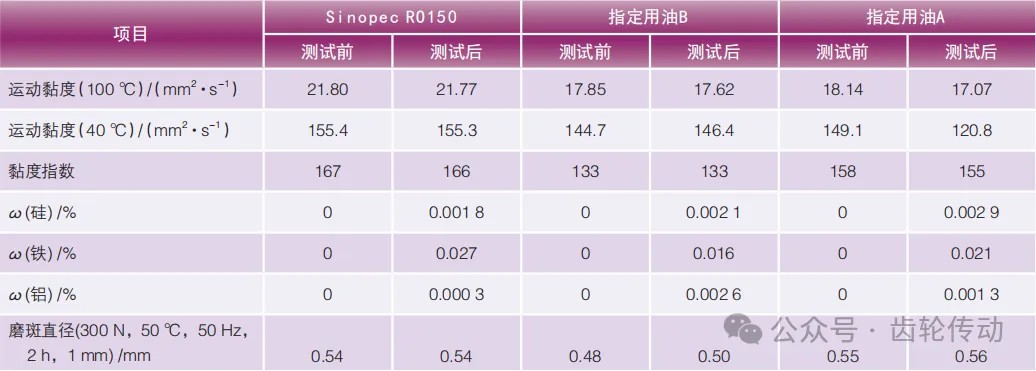 試驗前后油品的理化性能見表3。由表3可以看出,試驗后Sinopec RO150和指定用油A、B的黏度等級都在150黏度范圍內,雜質元素和磨損金屬元素含量增加量在合理范圍內。