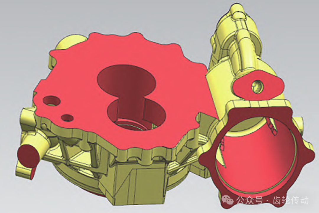 燃油系統及其附件是航空發動機的重要組成部分,其主要功能是向發動機燃燒室供給精確計量的燃油用于燃燒。其中齒輪泵殼體是燃油附件的典型殼體,各項性能指標要求極高,內腔油路復雜,加工周期長、成本高;且外形結構構造復雜(見圖1),內腔油路較多且多個厚壁、薄壁相互交錯,變截面極多(見圖2);“8字腔”處壁厚為40mm,而油濾罐處壁厚僅為4.5mm,需通過最大10MPa的強度試驗。由于外形構造復雜,不同位置的形狀、尺寸變化極大,導致模具內型腔結構極不規則,大尺寸薄壁部位容易產生冷隔甚至澆不足缺陷,鑄造難度極大。該鑄件自生產以來,合格率一直較低,質量波動較大,嚴重影響科研和生產交付任務,需研究改進工藝。而Anycasting鑄造模擬軟件可以模擬溫度場、鋁液充型速度、流場等多物理場。預測各種鑄造缺陷,降低試錯成本,縮短研制周期,為大批量鑄造生產提供可靠保證 。