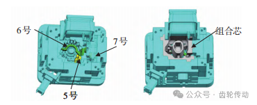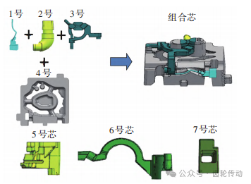 該齒輪泵殼體為鋁制鑄造件,因結構復雜,載荷較高,采用了金屬型傾轉鑄造工藝。通過減少鋁液澆注過程中湍流和氣體的卷入,保證了組織致密、表面質量良好。該工藝方案共使用了7個砂芯用以形成鑄件的內腔結構,其中的4個砂芯組合成一組組合芯,澆注開始時在金屬外模上進行整體下芯,另外3個砂芯單獨在外模上進行配裝下芯。圖3為砂芯示意圖,圖4為澆注時下芯示意圖。由于殼體內腔復雜,異型結構多,壁厚各異,局部尺寸突變大,導致工藝采用的砂芯數量多,工藝性差。