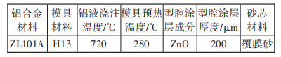 (1)數值模擬參數設置為提升工藝分析改進效能,通過Anycasting 鑄造仿真軟件對工藝參數進行分析對比。在建立齒輪泵殼體毛坯及模具砂芯三維模型基礎上,利用Anycasting軟件對模型進行網格劃分、參數設置及模擬仿真分析鑄造缺陷產生的原因;然后進行工藝優化與生產驗證。網格劃分選擇均勻網格,網格數約900萬。ZL101A鋁合金材料、模具材料H13的熱物理性能參數選擇內設標準參數,如表1所示。