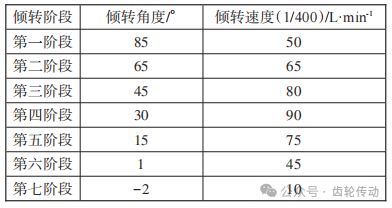 傾轉速度是鑄造過程關鍵因素,選擇合理可以確保鋁液充型平穩,充型壓力高,排氣效果好,避免金屬液飛濺產生的氣孔和氧化夾渣等缺陷。為分析鑄造過程及工藝要求,在仿真軟件中將充型過程劃分為7個階段,對照實際過程設定了7個典型傾轉速度參數,如表2所示。