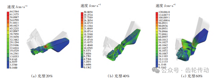 (2)數值模擬分析結果圖7所示為充型20%、40%、60%的流場模擬圖片,可以看出,隨著傾轉角度的增大,鋁液緩慢地從料斗處進澆到型腔中,直至最后充滿整個型腔。整個充型過程平穩,鋁液流速沒有超過50cm/s. 而J.Campbell的研究指出,當合金液的流速超過50cm/s時,合金液的表面會產生紊流,容易導致卷氣現象,最終在鑄件上形成氣渣孔缺陷。模擬結果說明傾轉參數設置的比較合理,與實際生產結果相吻合,鑄件因為氣渣孔缺陷報廢的占比很少。