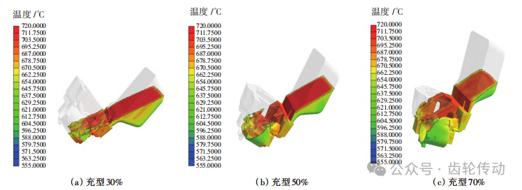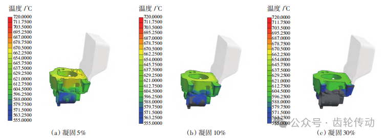 圖 12 工藝改進后鋁液充型與凝固過程溫度模擬示意圖