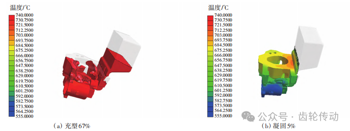 圖12為工藝工藝改進后充型67%,凝固5%的溫度場模擬圖片??梢钥闯觯蜑V罐部位充型完畢后,溫度保持在700℃左右,與改進前溫度場相比,溫度明顯升高。從凝固模擬圖片可以看出,工藝參數改進后鋁液還是先從油濾罐部開始凝固,與工藝參數改進前凝固順序相同。但是凝固同樣比例為5%,工藝參數改進前用時42.5s,工藝改進后用時46.6s,說明工藝參數改進后鋁液充型溫度高,可以進行充分流動,能夠避免出現冷隔甚至澆不足缺陷。工藝改進措施實施后,澆不足缺陷得到了明顯改善,已由改進前的45.3%降低至8.4%,工藝改進后鑄件合格率由22.2%大幅提升至68.7%.