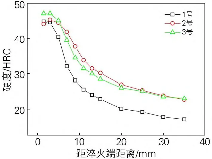 3種試驗(yàn)鋼中,3號鋼的淬火端硬度最高,2號鋼的淬透性曲線斜率變化最小,而1號鋼的淬透性最低,其距淬火端3mm以上位置的硬度均明顯低于其他2種試驗(yàn)鋼。