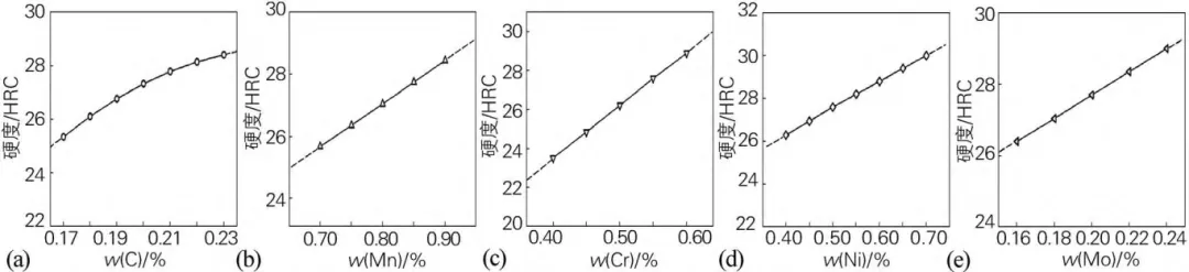 可以看出,距淬火端9mm位置硬度隨著C含量的增加明顯增大,在0.17%~0. 23%范圍內(nèi),C含量每提高0.01% ,硬度值平均提高約0.52HRC,同時,隨著Mn、Cr、Ni和Mo含量的單獨(dú)增加,距淬火端9mm位置硬度值也相應(yīng)增加,Mn、Cr、Ni、Mo含量每提高0.01%,距淬火端9mm位置硬度分別增加約0.14、0.27、0.12、0.33HRC。