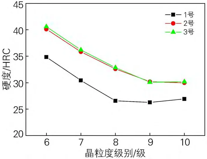 從圖5可以看出,隨著3種齒輪鋼晶粒度級別的增加,距淬火端9mm位置硬度整體呈現(xiàn)下降的趨勢,晶粒度8~9級以下時,距淬火端9mm 位置硬度隨晶粒度等級的增加快速下降,而晶粒度級別較高時,硬度變化變緩,趨于穩(wěn)定。