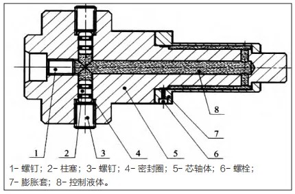 由于此時薄壁是各處均勻受壓,所以它是向四周均勻膨脹,內孔夾緊后的夾持精度很高。圖1為靜壓液漲芯軸夾具的結構原理圖。