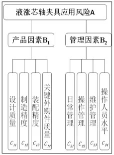 建立液漲芯軸夾具風險模糊評價體系,該體系的二級影響因素分為產品因素和管理因素兩大類,每個二級影響因素都有4個三級影響因素,所建立的風險模糊評價體系如圖4所示。