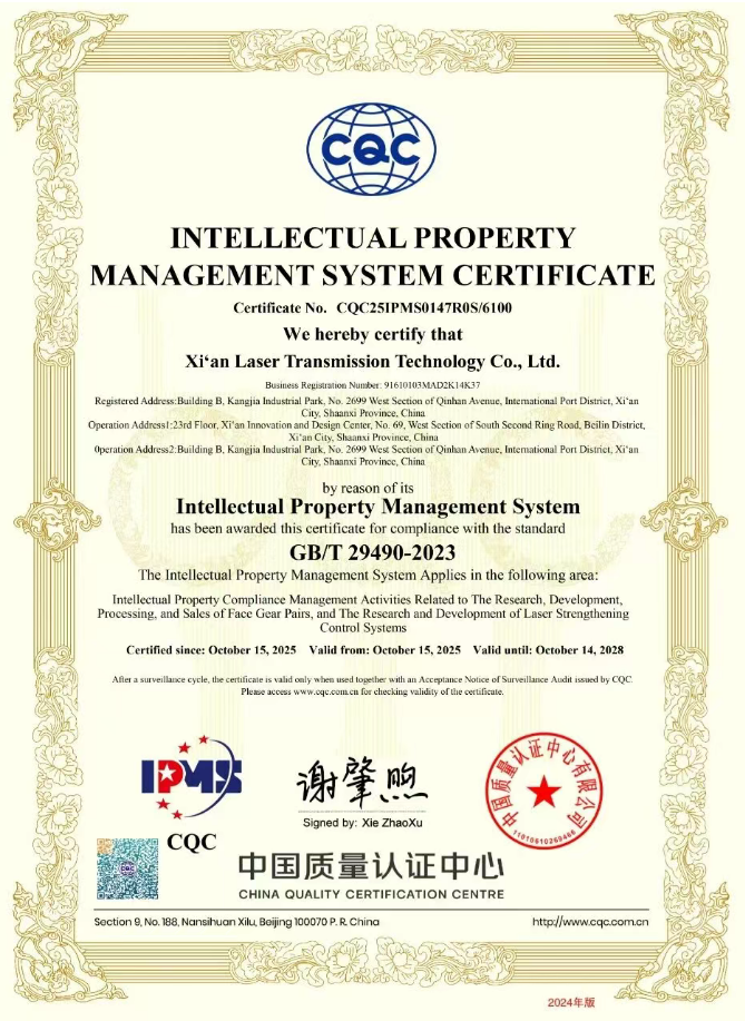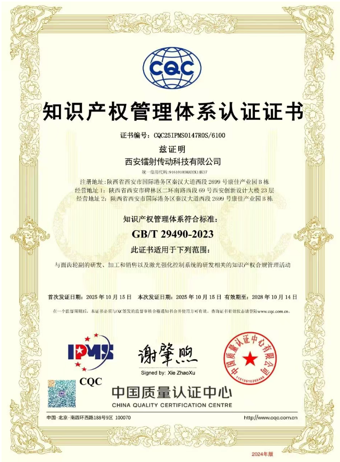 近日,西安鐳射傳動科技有限公司(以下簡稱“鐳射傳動”)正式通過國家權威機構——中國質量認證中心的嚴格審核,榮獲 《知識產權管理體系認證證書》證書編號CQC25IPMS0147R0S/6100,標志著公司在知識產權規范化、系統化管理方面邁上新臺階!
