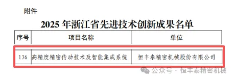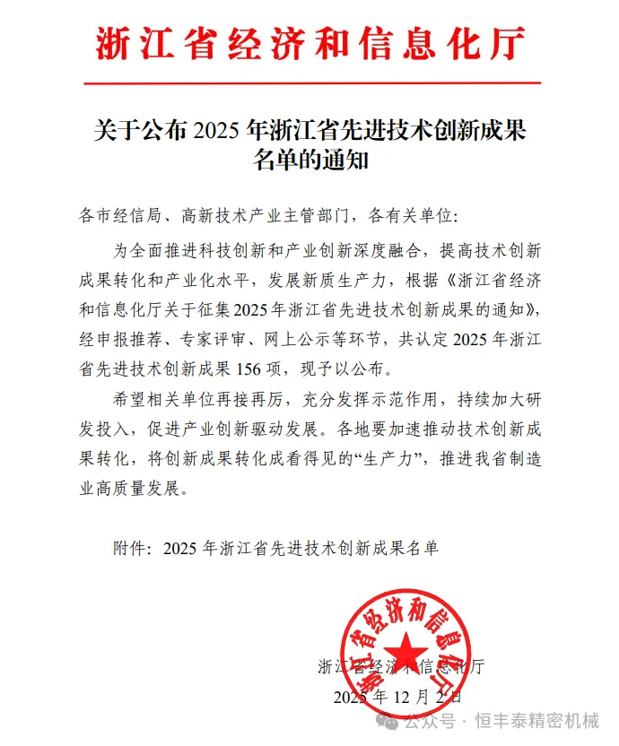近日,浙江省經濟和信息化廳正式發布《關于公布2025年浙江省先進技術創新成果名單的通知》。經申報推薦、專家嚴格評審及社會公示等多輪遴選,全省共認定156項具有顯著行業引領性與技術前瞻性的創新成果。恒豐泰自主研發的“高精度精密傳動技術及智能集成系統”成功入選,彰顯了公司在精密傳動領域的領先地位。