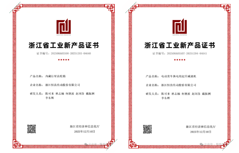 2025年12月10日,浙江恒齒傳動股份有限公司自主研發(fā)的 “內(nèi)藏行星齒輪箱” 與 “電動貨車換電用起升減速機” 雙雙通過專家驗收,榮獲 “浙江省工業(yè)新產(chǎn)品” 認定。這不僅是企業(yè)在產(chǎn)品創(chuàng)新道路上的重要里程碑,也標志著恒齒傳動在高端傳動裝備自主研發(fā)與產(chǎn)業(yè)化方面邁出了堅實一步。